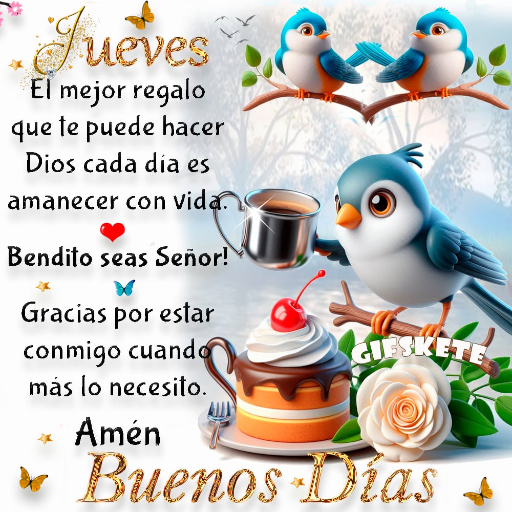 Jueves El mejor regalo que te puede hacer Dios cada día es Amanecer con vida. Bendito seas Señor Gracias por estar conmigo cuando más lo necesito. Amén BUENOS DÍAS