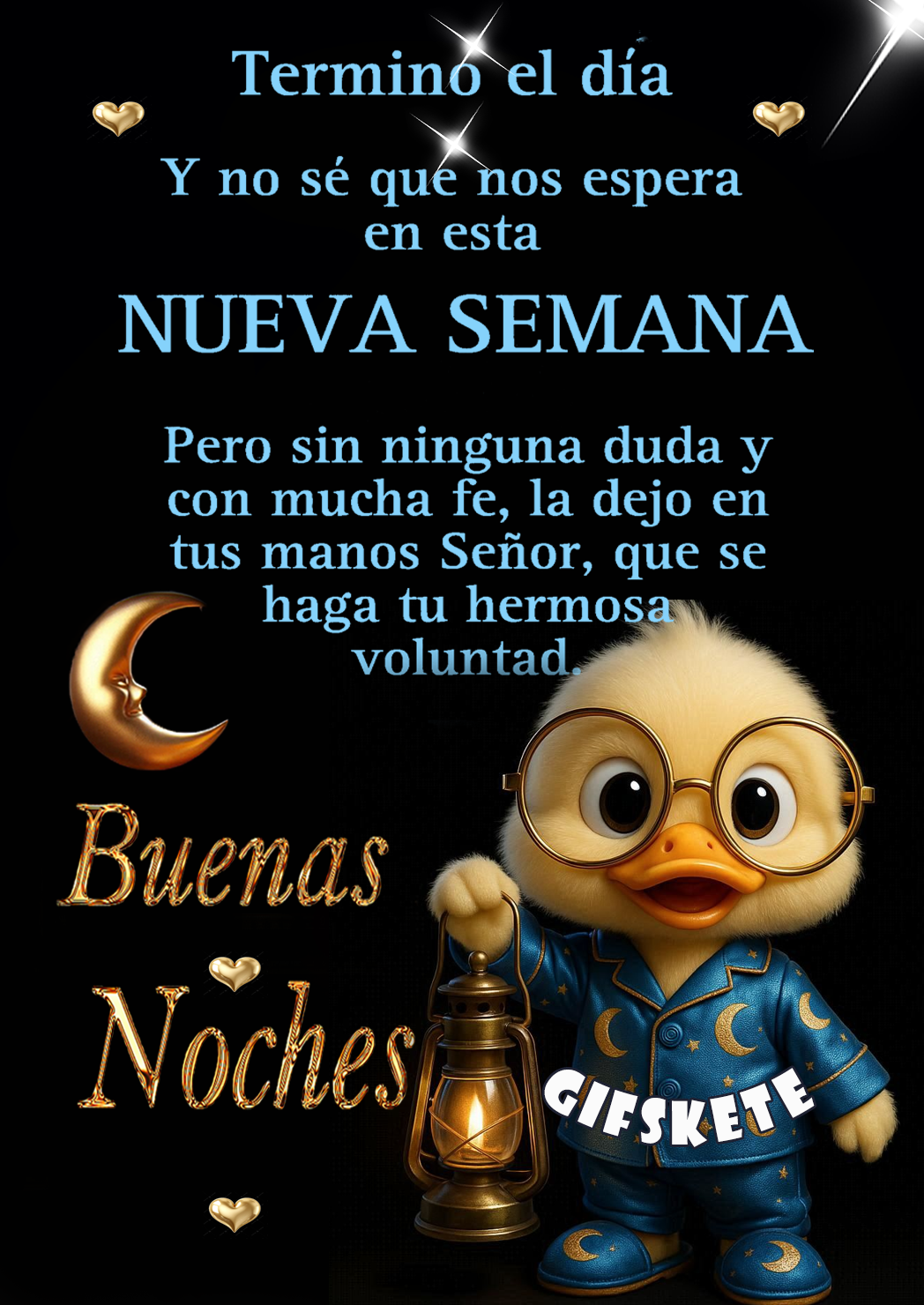 Terminó el día Y no sé qué nos espera en esta NUEVA SEMANA Pero sin ninguna duda y con mucha fe, la dejo en tus manos, Señor, que se haga tu hermosa voluntad. Buenas noches