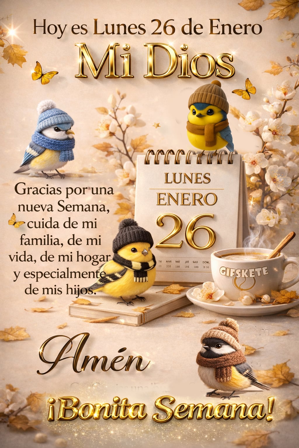 Hoy es lunes 26 de enero. Mi Dios Gracias por una nueva semana; cuida de mi familia, de mi vida, de mi hogar y especialmente de mis hijos. Amén. ¡Bonita semana!
