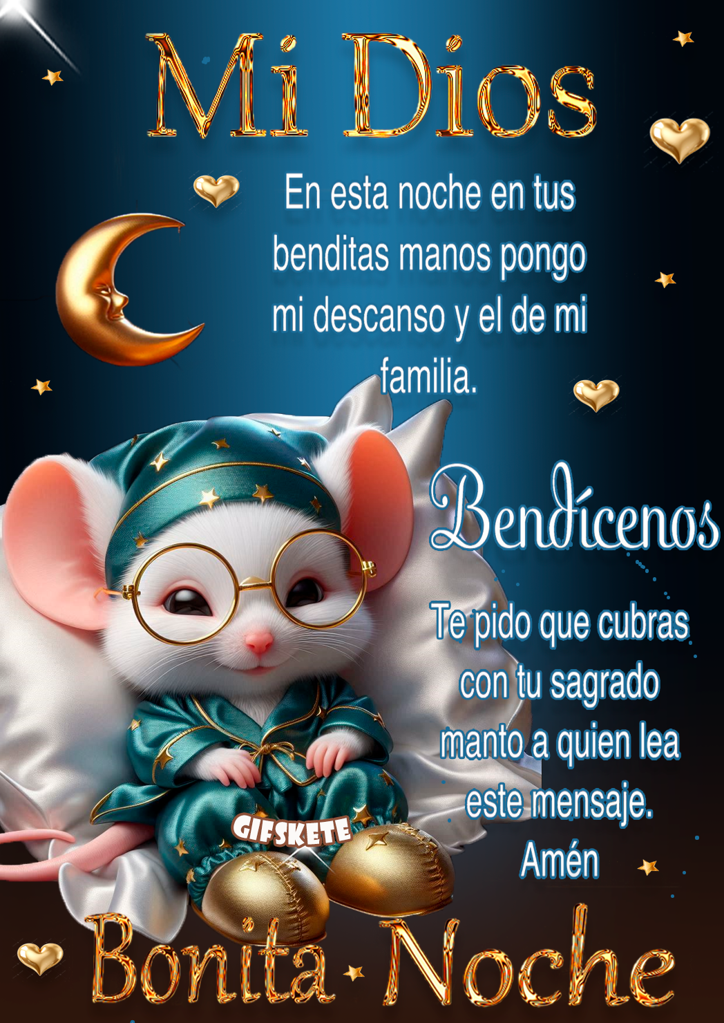 ¡Mi Dios! Esta noche, en tus benditas manos, pongo mi descanso y el de mi familia. Bendícenos Te pido que cubras con tu sagrado manto a quien lea este mensaje. Amén. Buenas noches. Buenas...