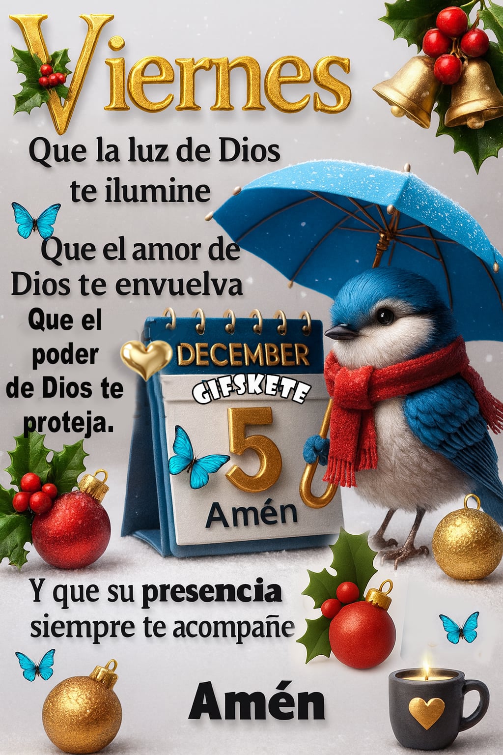 Viernes Que la luz de Dios te ilumine Que el amor de Dios te envuelva Que el poder de Dios te proteja. Y que su presencia siempre te acompañe Amén.