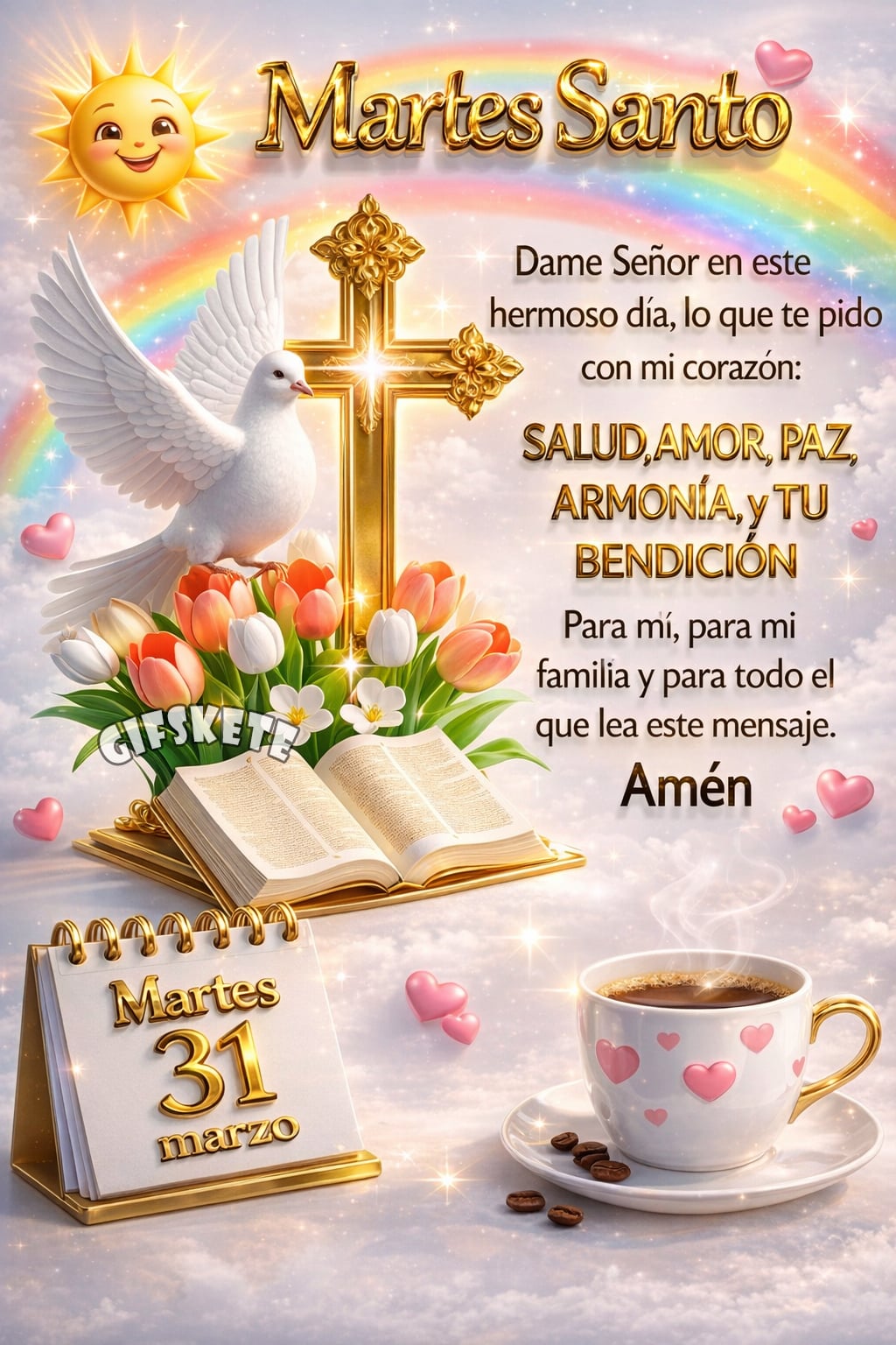 Martes Santo Dame Señor en este hermoso día, lo que te pido con mi corazón SALUD, AMOR, PAZ, ARMONÍA, y TU BENDICIÓN Para mi, para mi familia y para todo el que lea este...