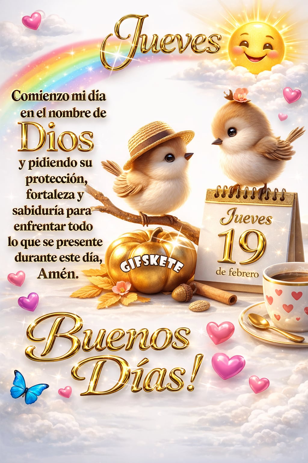 Jueves Comienzo mi día en el nombre de Dios y pidiendo su protección, fortaleza y sabiduría para enfrentar todo lo que se presente durante este día. Amén. Jueves 19 de febrero ¡Buenos días! ...