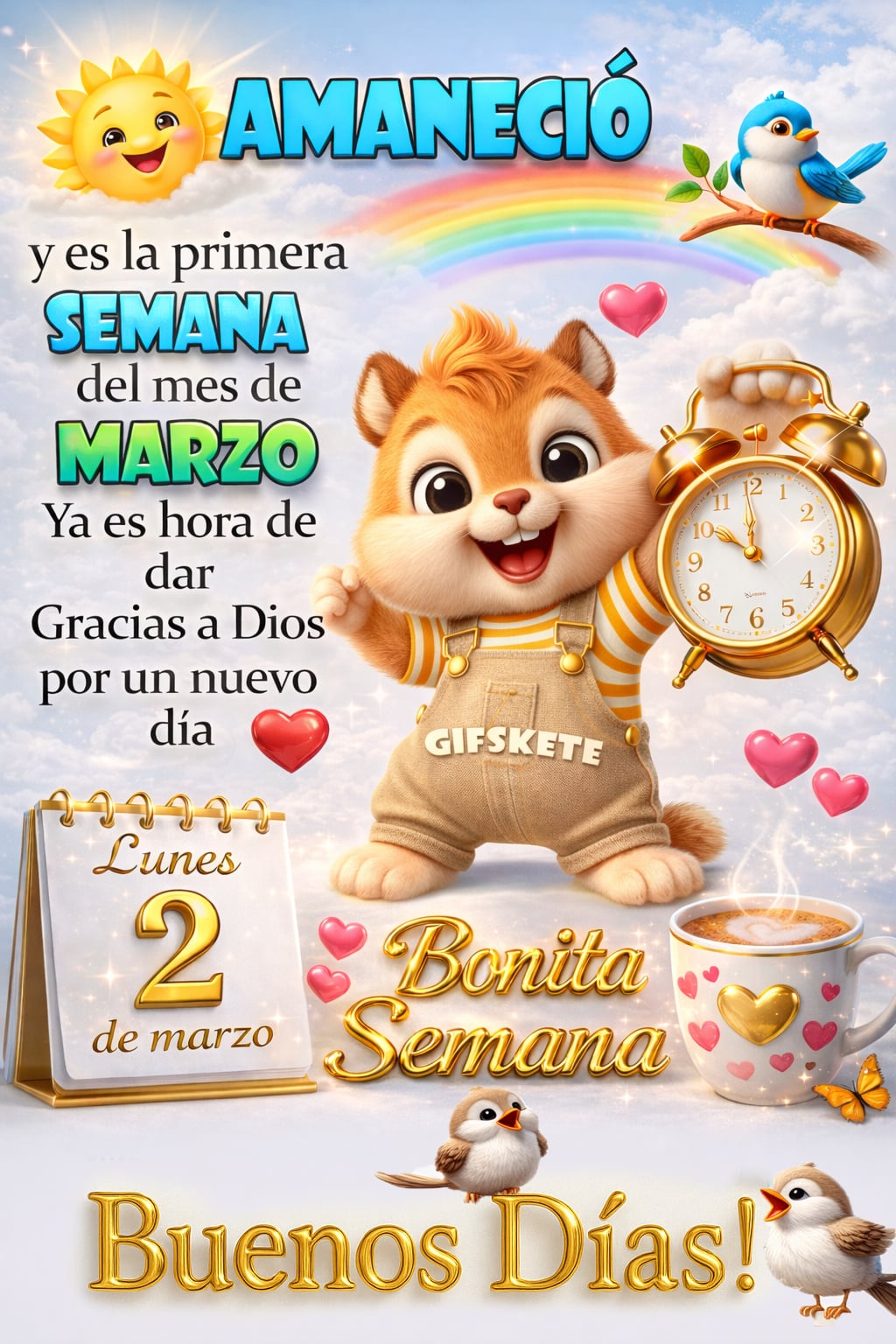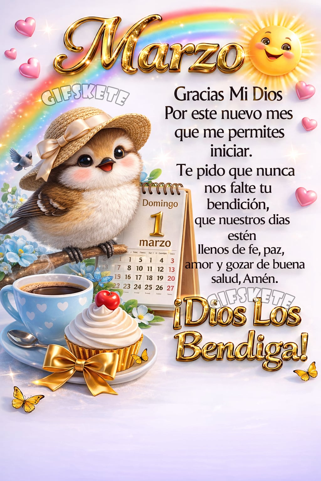 Marzo Gracias mi Dios, por este nuevo mes que me permites iniciar. Te pido que nunca nos falte tu bendición, que nuestros días estén llenos de fe, paz, amor y gozo de buena salud....