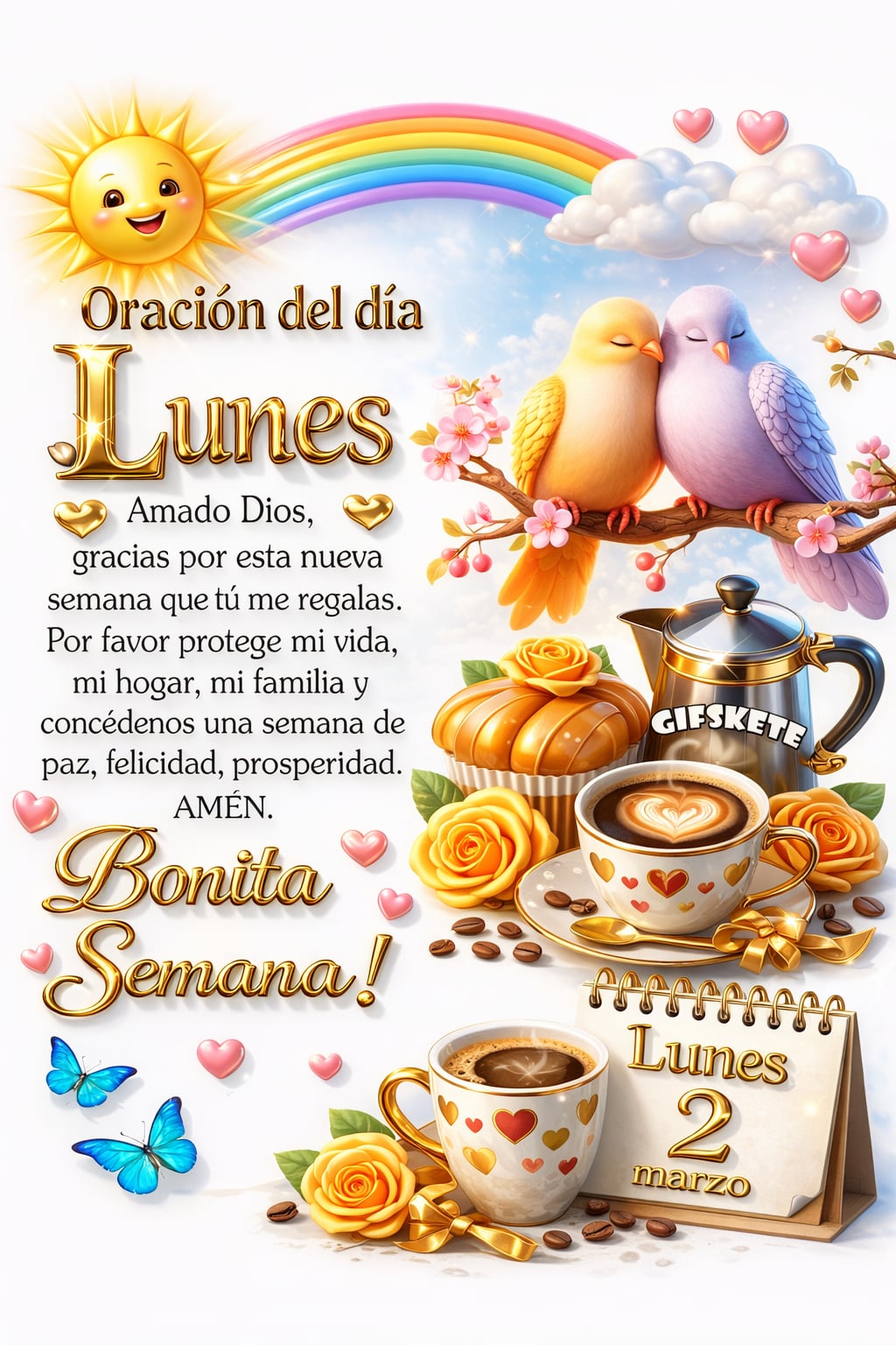 Oración del día Lunes Amado Dios, gracias por esta nueva semana que tú me regalas. Por favor, protege mi vida, mi hogar, mi familia y concédenos una semana de paz, felicidad, prosperidad. AMÉN. Bonita...