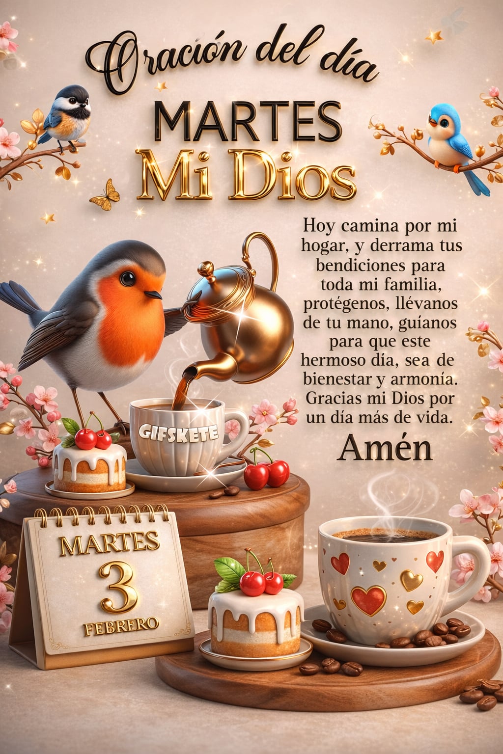 Oración del día MARTES Mi Dios Hoy camina por mi hogar, y derrama tus bendiciones para toda mi familia; protégenos, llévanos de tu mano, guíanos para que este hermoso día, sea de bienestar y...