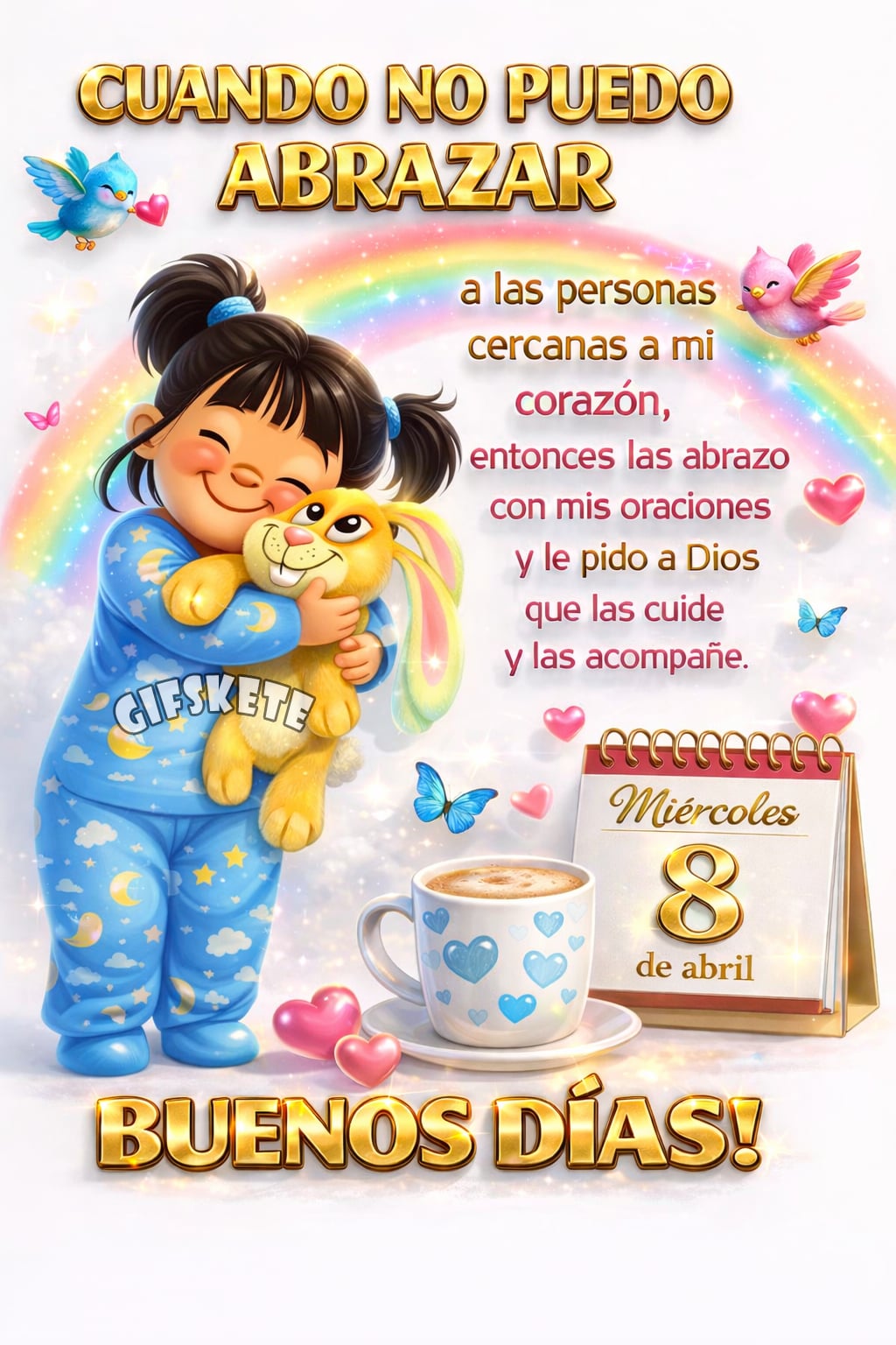 CUANDO NO PUEDO ABRAZAR a las personas cercanas a mi corazón, entonces las abrazo con mis oraciones y le pido a Dios que las cuide y las acompañe. Miércoles 8 de abril BUENOS DÍAS!...