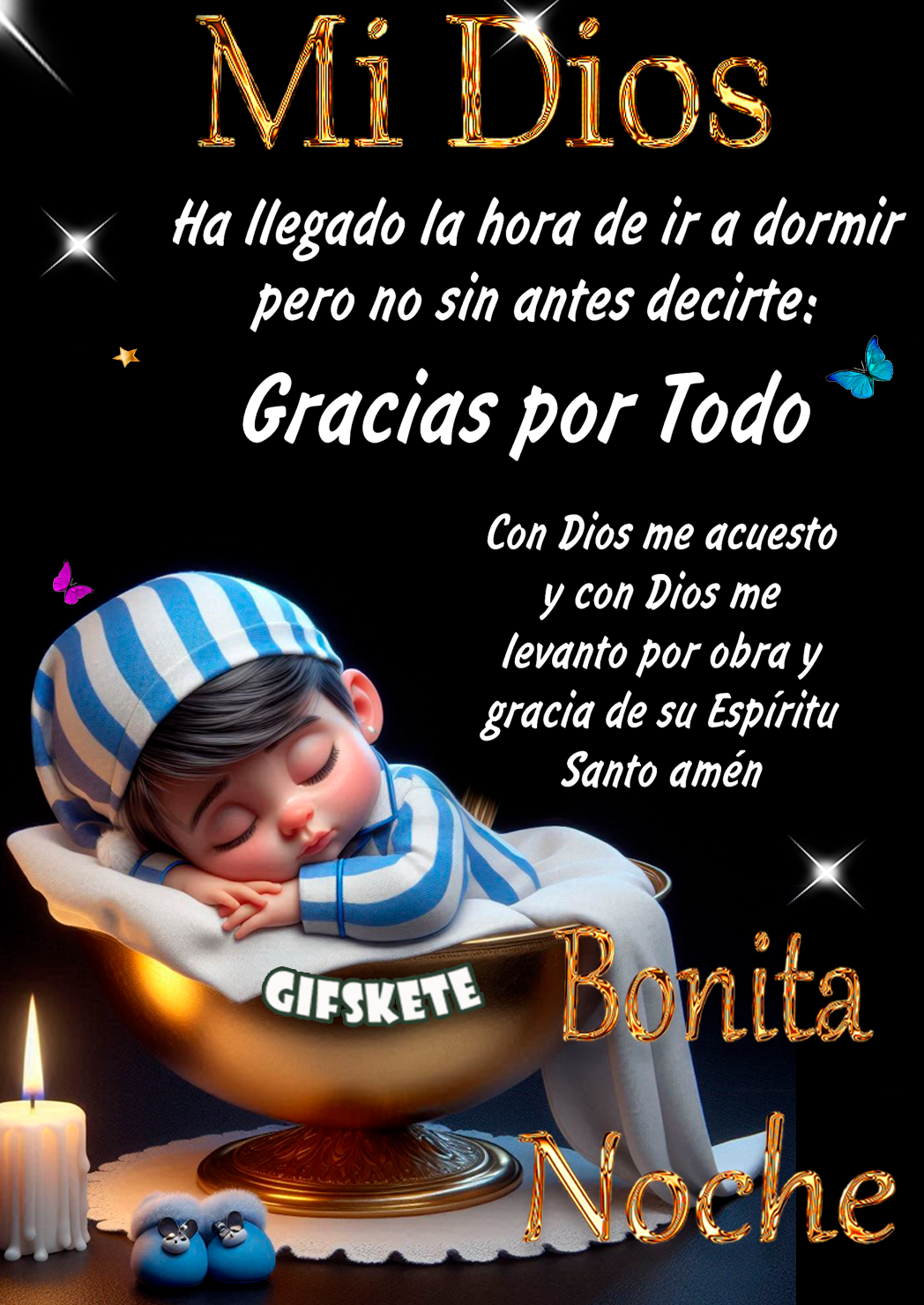 Mi Dios! Ha llegado la hora de ir a dormir, pero no sin antes decirte: Gracias por todo. Con Dios me acuesto y con Dios me levanto por obra y gracia de su Espíritu...