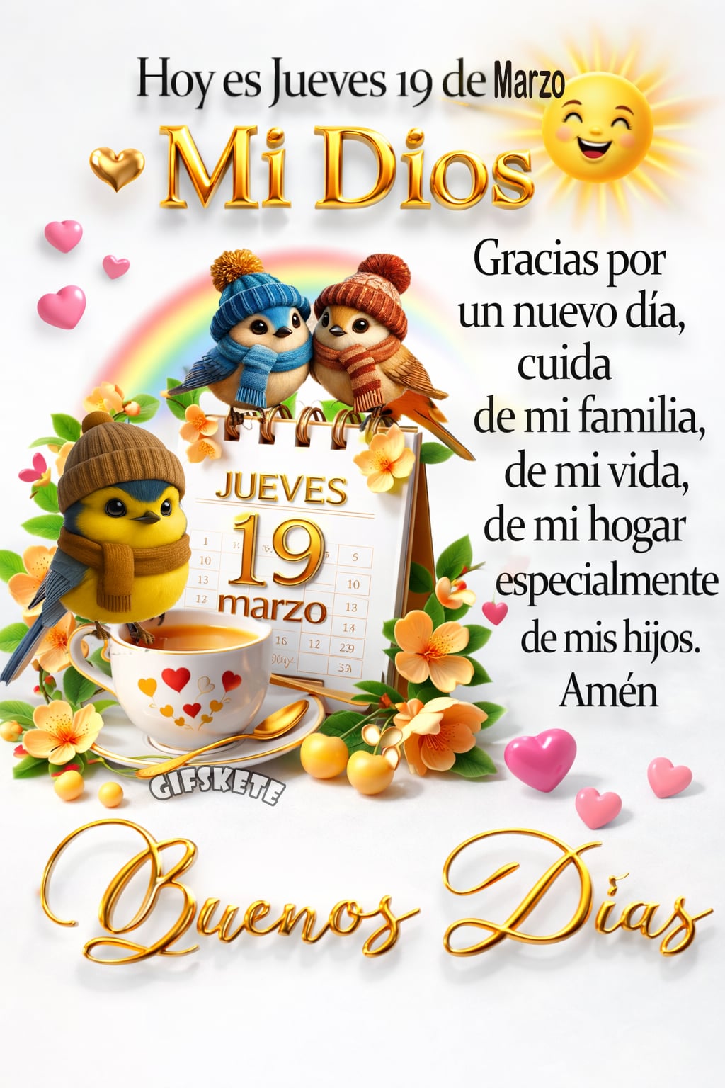 Hoy es jueves 19 de marzo. Mi Dios Gracias por un nuevo día; cuida de mi familia, de mi vida, de mi hogar, especialmente de mis hijos. Amén. Buenos días. Spread the love
