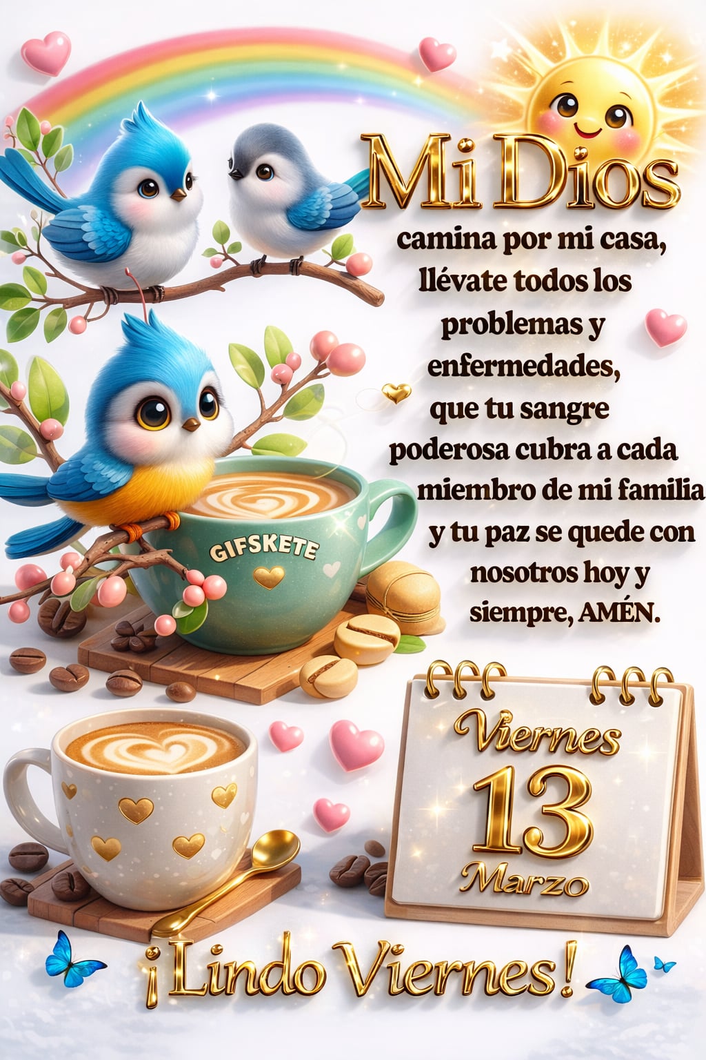 Viernes Que en este bello día las bendiciones de Dios entren en tu hogar y en tu corazón, y las manos de Dios protejan tu vida y la de quienes amas. Buenos días.